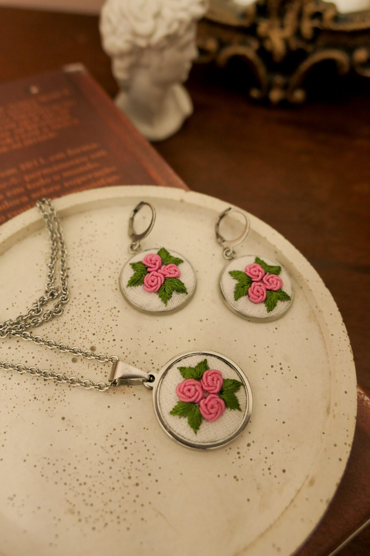 Replicando belas criações de pontos com rococó, criamos esse conjunto de acessórios bordados com flores rosas contendo brinco e medalhinha para quem adora adicionar pequenos detalhes de delicadeza e romantismo ao seu estilo!